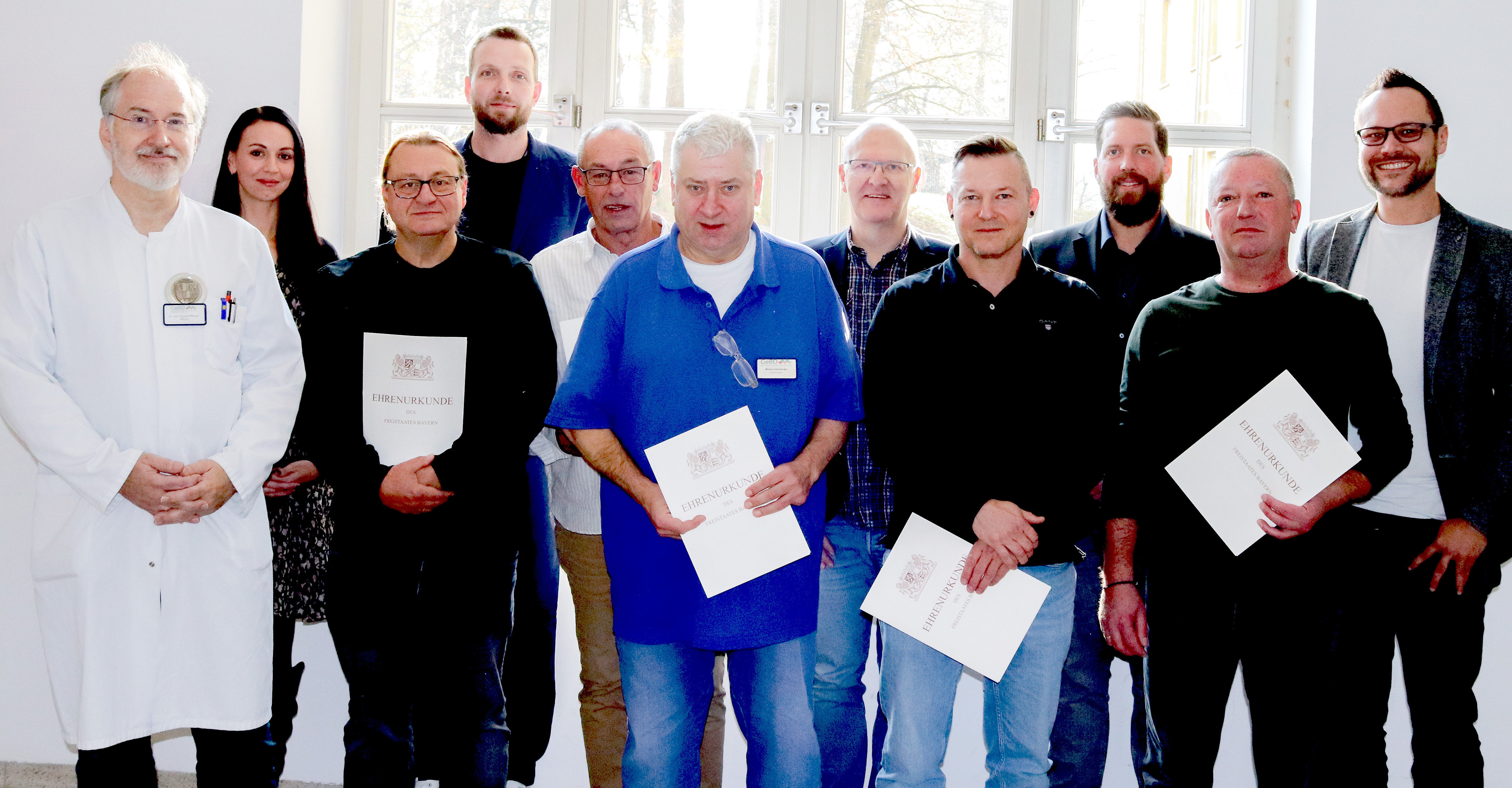 Und das quer durch alle Bereiche, von der Pflege über Sporttherapie, ärztlichen Dienst bis hin zur Verwaltung. Für 25 Jahre geehrt wurden Birk Seliger, Markus Hohenberger, Rupert Pflaum, Andre Hofmann, Frank Meier und Frank Orbach. Für 40 Jahre geehrt wurden Bernd Gropengießer, Vito Carofiglio, Andre Kocis, Angela Himsel, Ulrike Weiß, Thomas Fuß und Kunigunda Körber. Unser Bild zeigt die Geehrten, die an der Jubiläumsfeier teilnahmen, mit ihren Vorgesetzten. Foto: Sandra Zimmermann