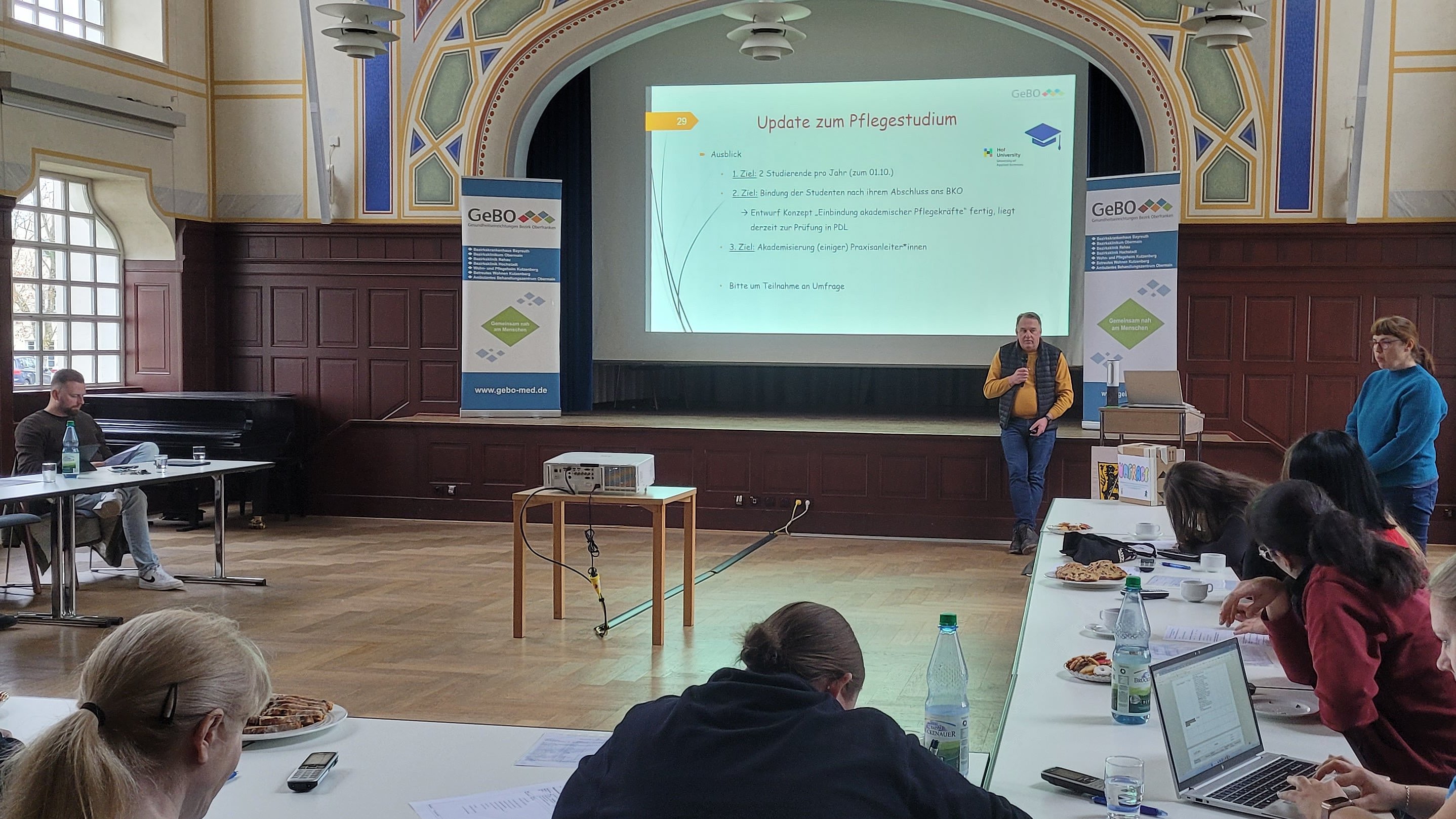 Die letzte Gesamtstationsleiterbesprechung für das Jahr 2025 am Standort Kutzenberg fand jetzt im Festsaal des BKO statt. Ziel der regelmäßigen Treffen ist es unter anderem Abläufe zu optimieren, zukünftige Projekte zu besprechen und einen direkten Austausch untereinander zu ermöglichen. Die Themen sind dabei vielfältig. Diesmal standen unter anderem der richtige Umgang mit Patienteneigentum, ein Update zum Stationsumzug von Haus 4 nach Haus 6 und die Kosten für die Nutzung von Dienstfahrzeugen auf der Tagesordnung.
