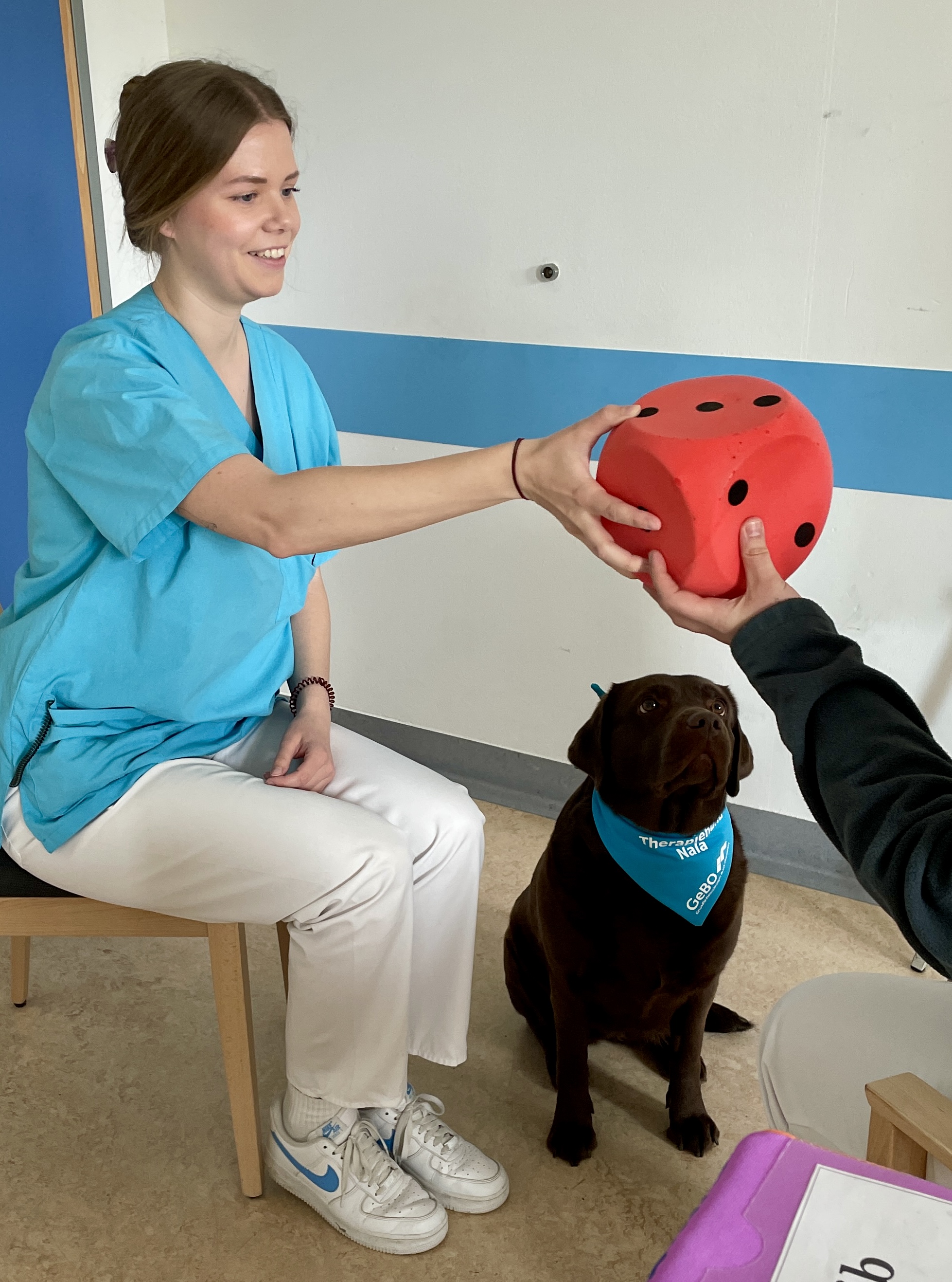 Unter der Woche absolviert sie ihre Schichten in der Klinik. Alle freuen sich, wenn Nala mit im Dienst ist: Kommandos einstudieren, an der Leine führen, streicheln, einen aufgebauten Parcours abgehen, Hundekekse backen… 30 bis 45 Minuten dauert meist eine Gruppenarbeit mit Nala. Nach so einer Einheit braucht sie eine Pause. „Ich muss darauf achten und genau erkennen, wann man abbrechen muss und der Hund nervös wird und gestresst ist. Nala krazt sich dann immer, hört nicht mehr gut oder geht einfach von selbst weg“, erklärt die Psychiatrie-Fachkrankenpflegerin. Im Gruppenraum ruht sie sich dann aus. Danach geht es weiter.